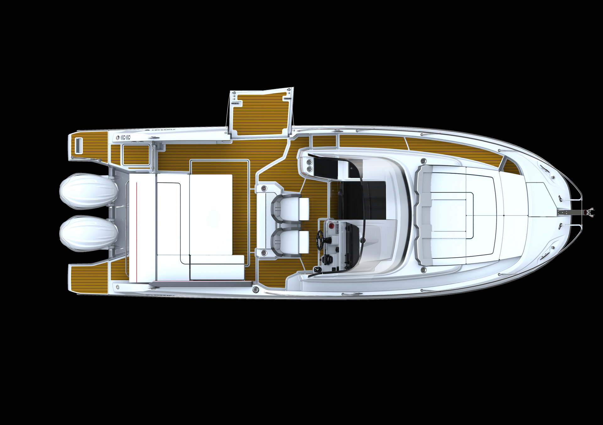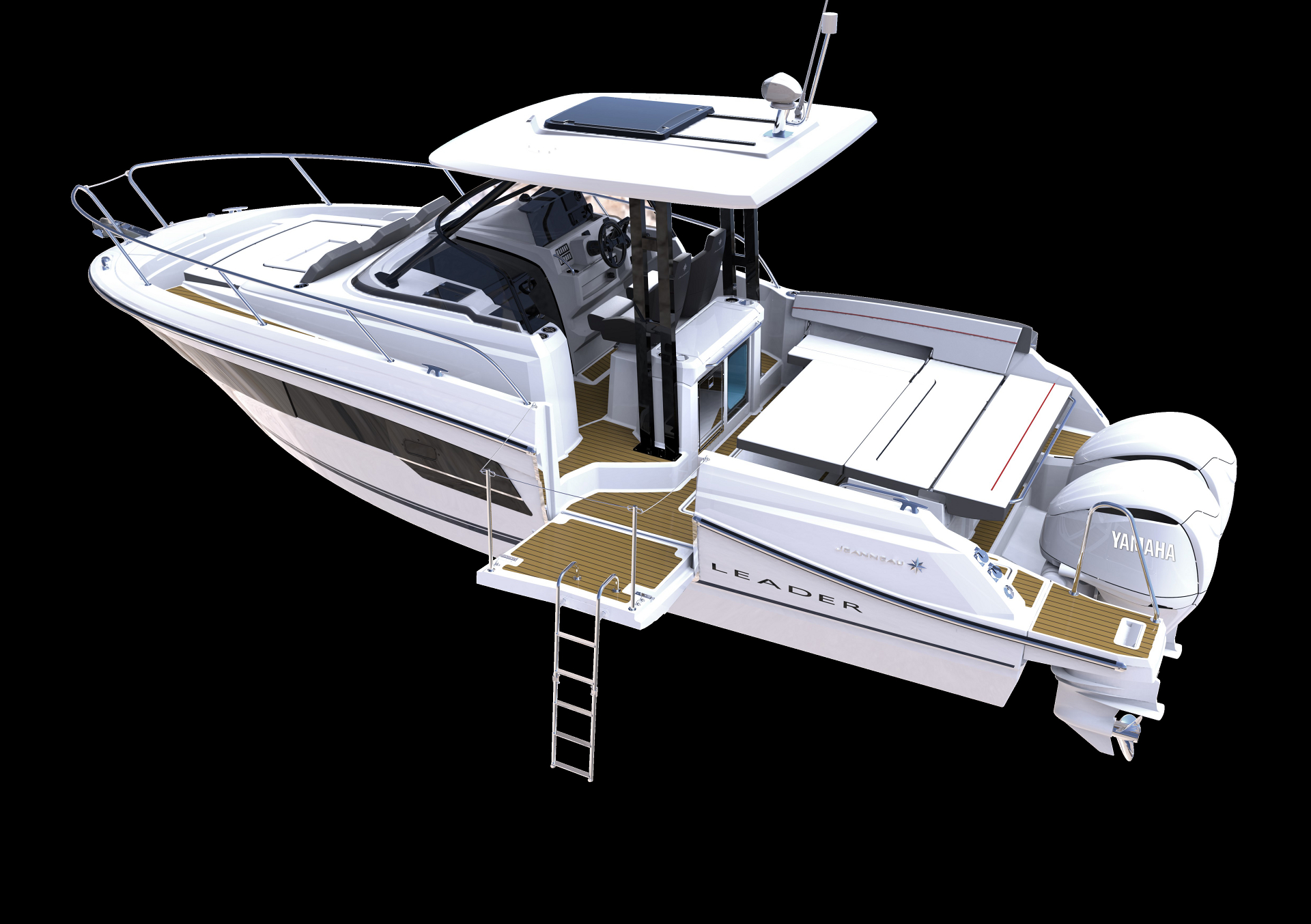 Spirited while cruising, the Leader 10.5 WA is dedicated to relaxation and a laid-back lifestyle when at anchor. The foldaway backrest of the aft bench seat transforms the aft cockpit into a vast sundeck in just seconds. The side terrace extends the cockpit and provides secure, easy access to the sea, for swimming in complete safety.
