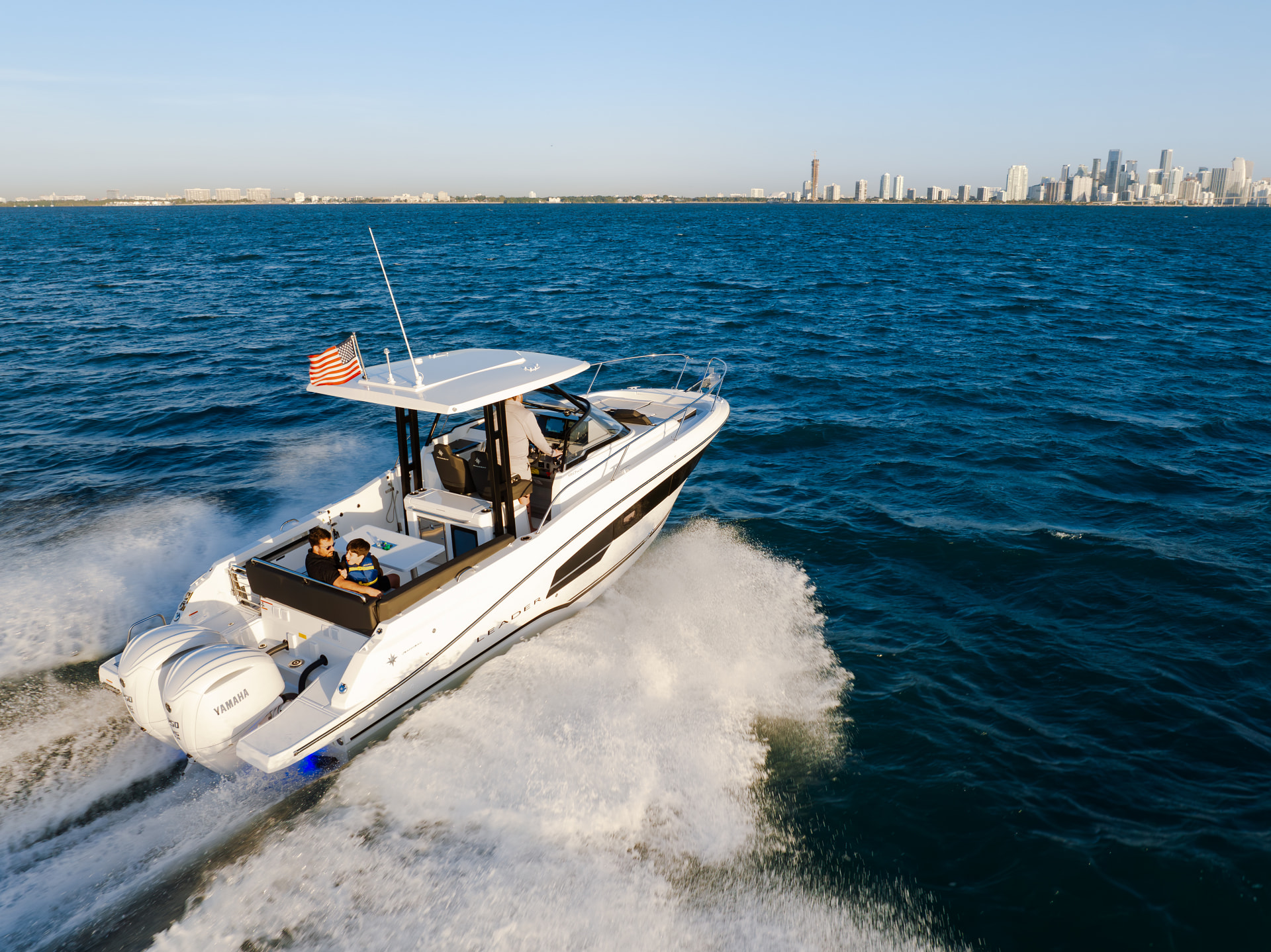 Boasting a V-shaped hull by Michael Peters and twin engines for up to 2 x 250 HP, the Leader 9.0 WA will delight thrill-seekers and fans of express crossings, the wind in their hair, with top speeds of over 40 knots. With elongated lines, a T-top, a protective glass windscreen, and large windows in the hull… this boat, inspired by the Leader 10.5 WA and 12.5 WA, boasts an elegant, distinguished, and contemporary style, yet one that is also synonymous with safety and fun for the whole family.