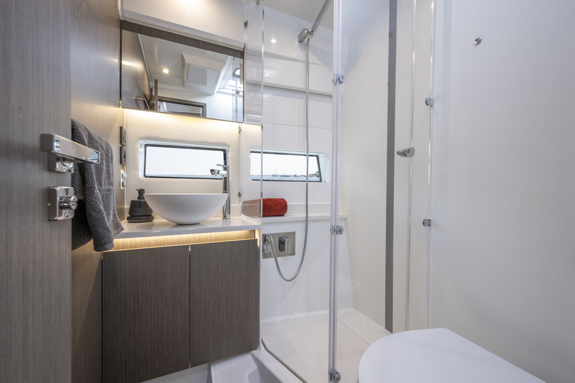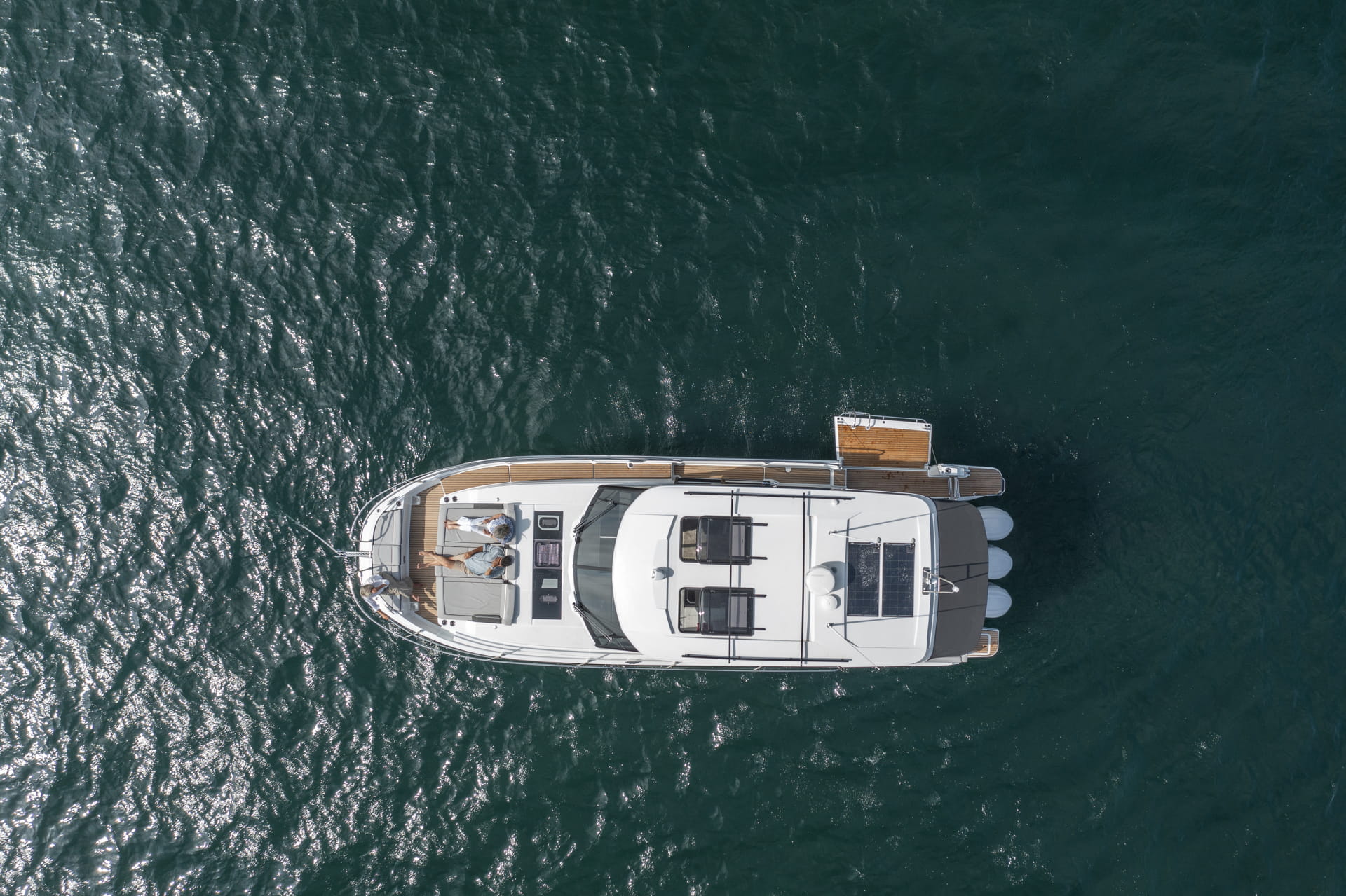 Our flagship model was designed as an apartment on the water and offers a spacious, luminous living area from the wheelhouse to the cockpit, featuring 360° views of the sea and two sunroofs that open. The U-shaped galley seamlessly connects indoor and outdoor spaces, perfect for gatherings and easy movement. Inside, a cozy salon awaits with plush seating, rounded edges, armrests, and leather handrails, centered around an extendable table with two leaves for ample seating.