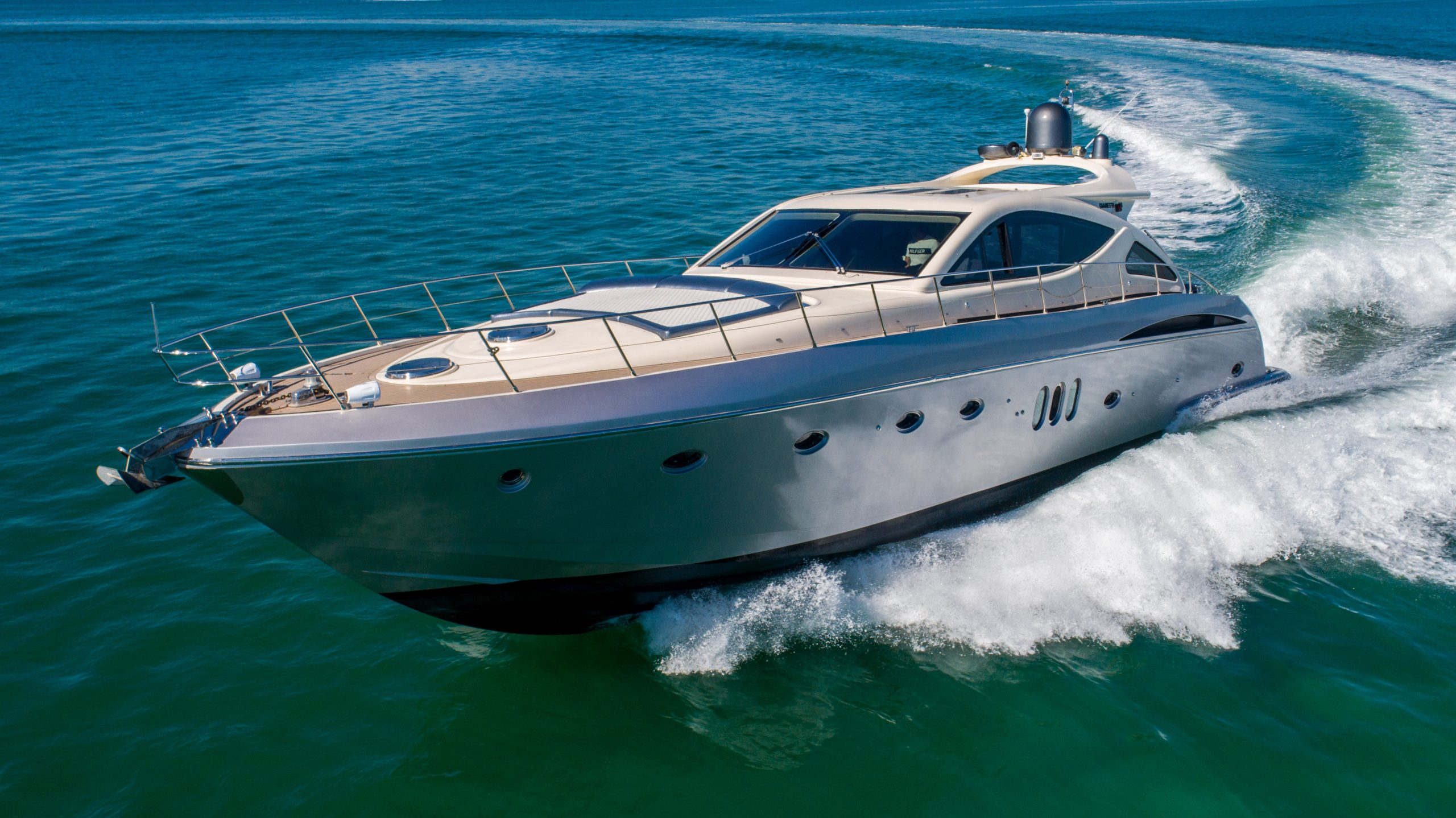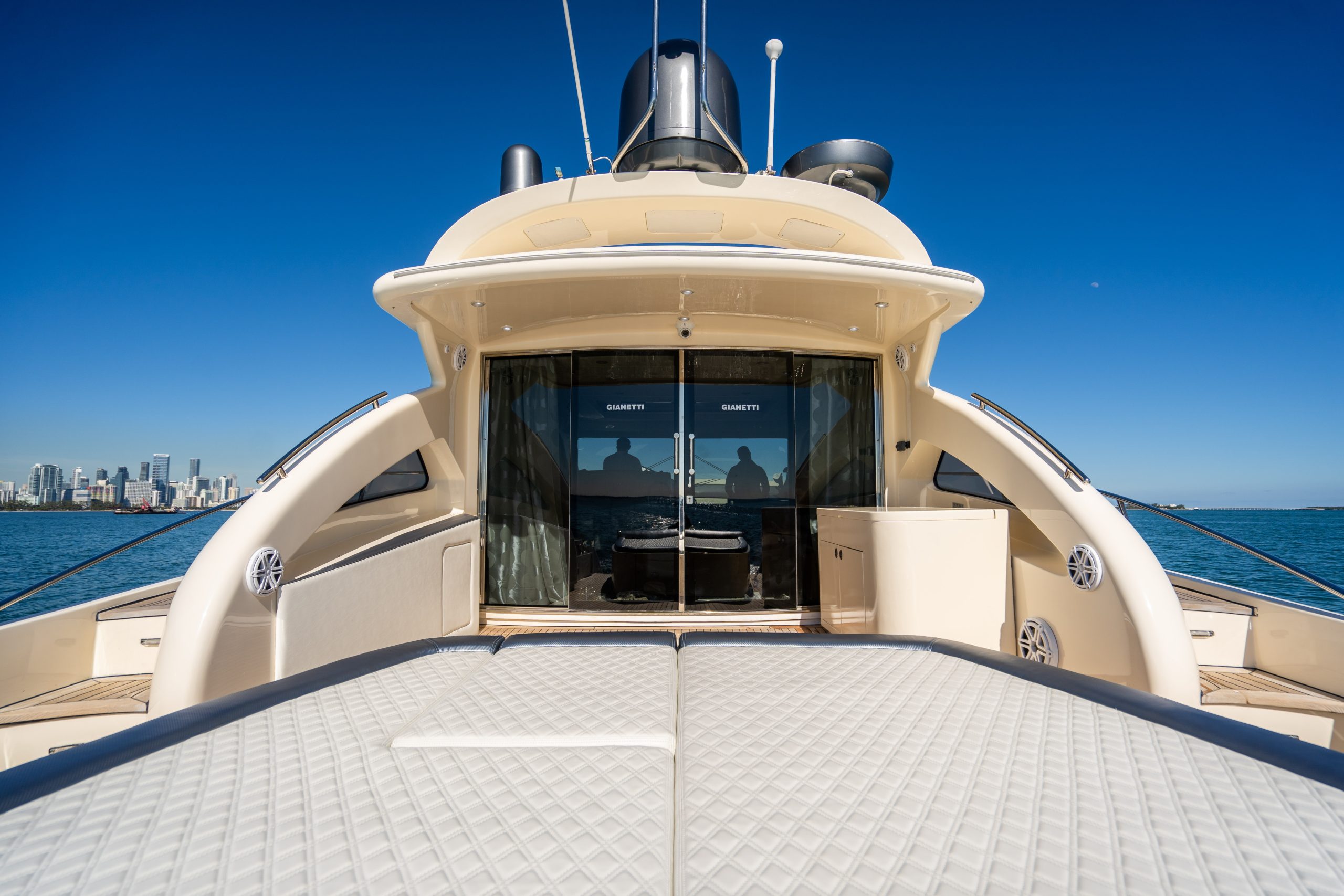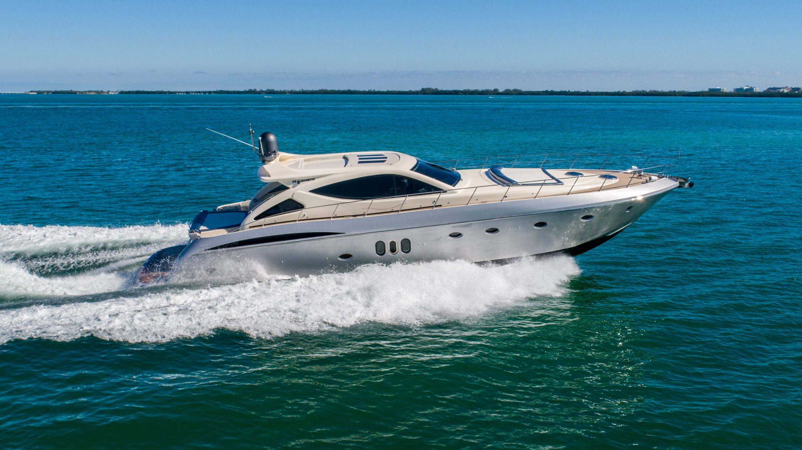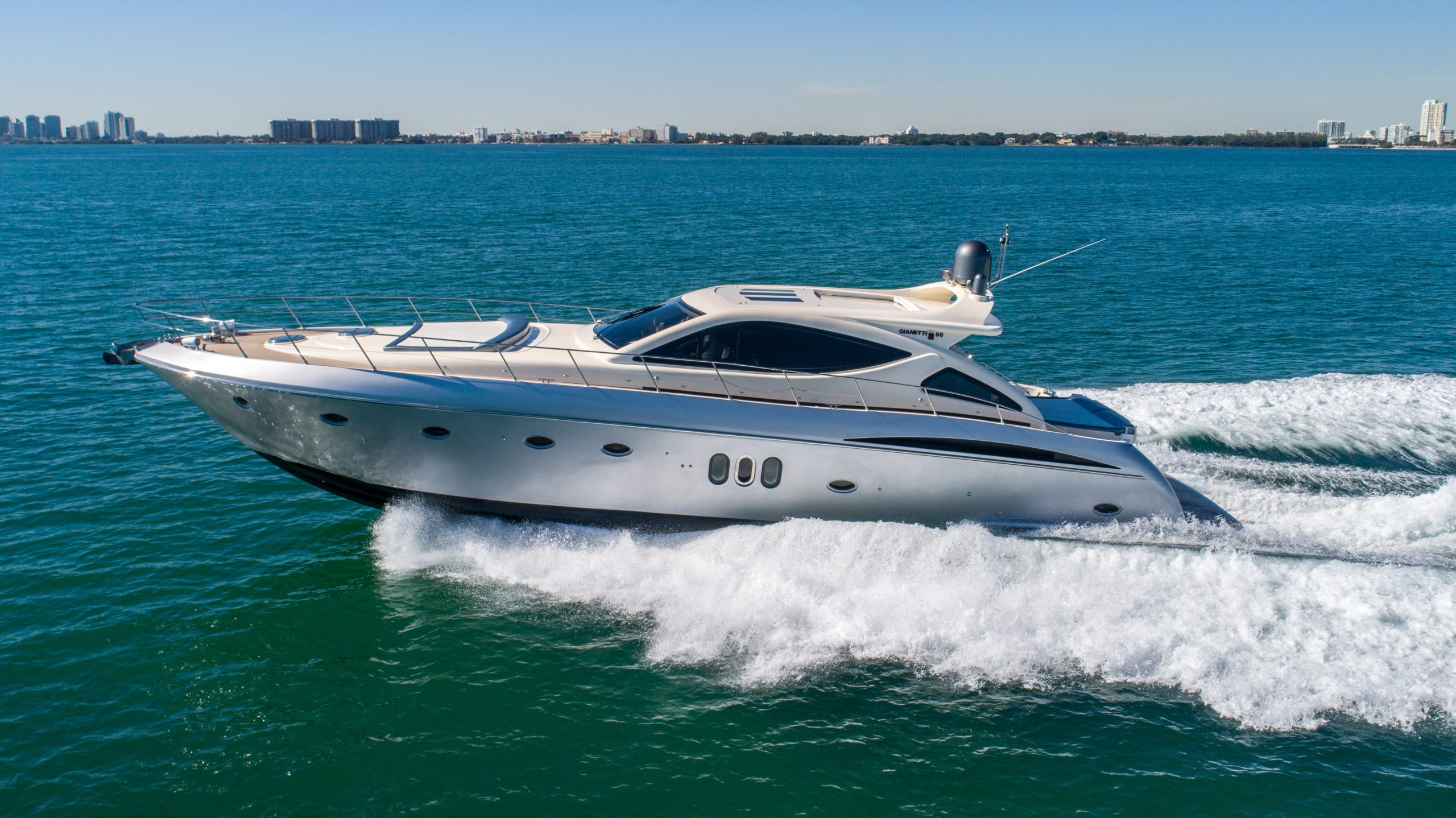 From the premium stereo system, flat-screen TV’s you will feel like you are in the lap of luxury. This yacht is particularly well arranged for hosting large parties with it’s wide open and thoughtfully arranged salon area. The 68 Gianetti is a sleek and fast vessel capable of cruising at around 30 knots.