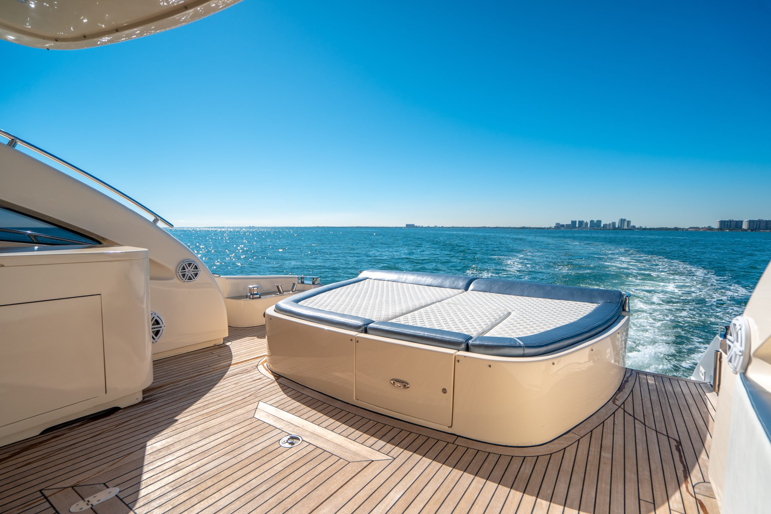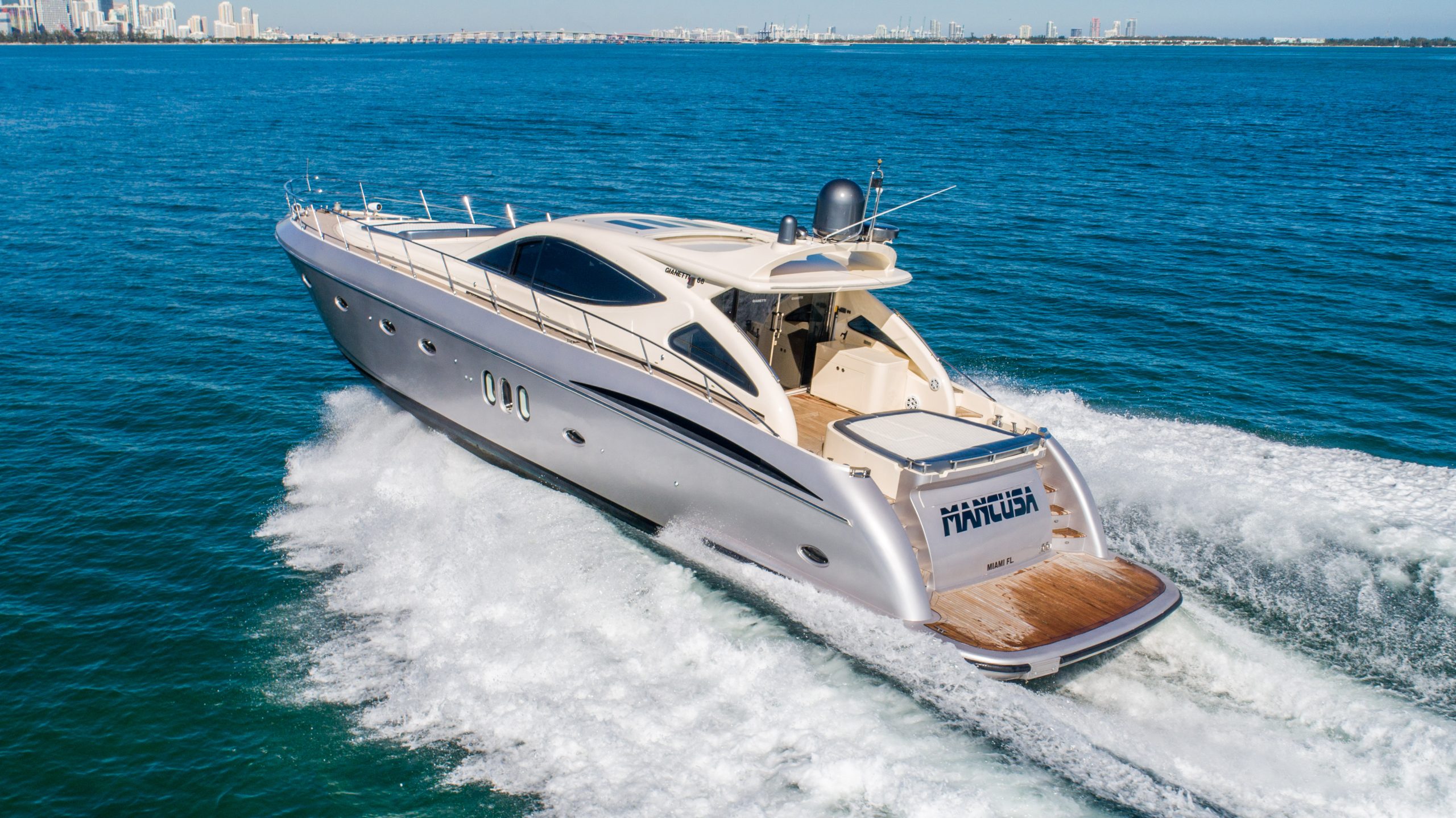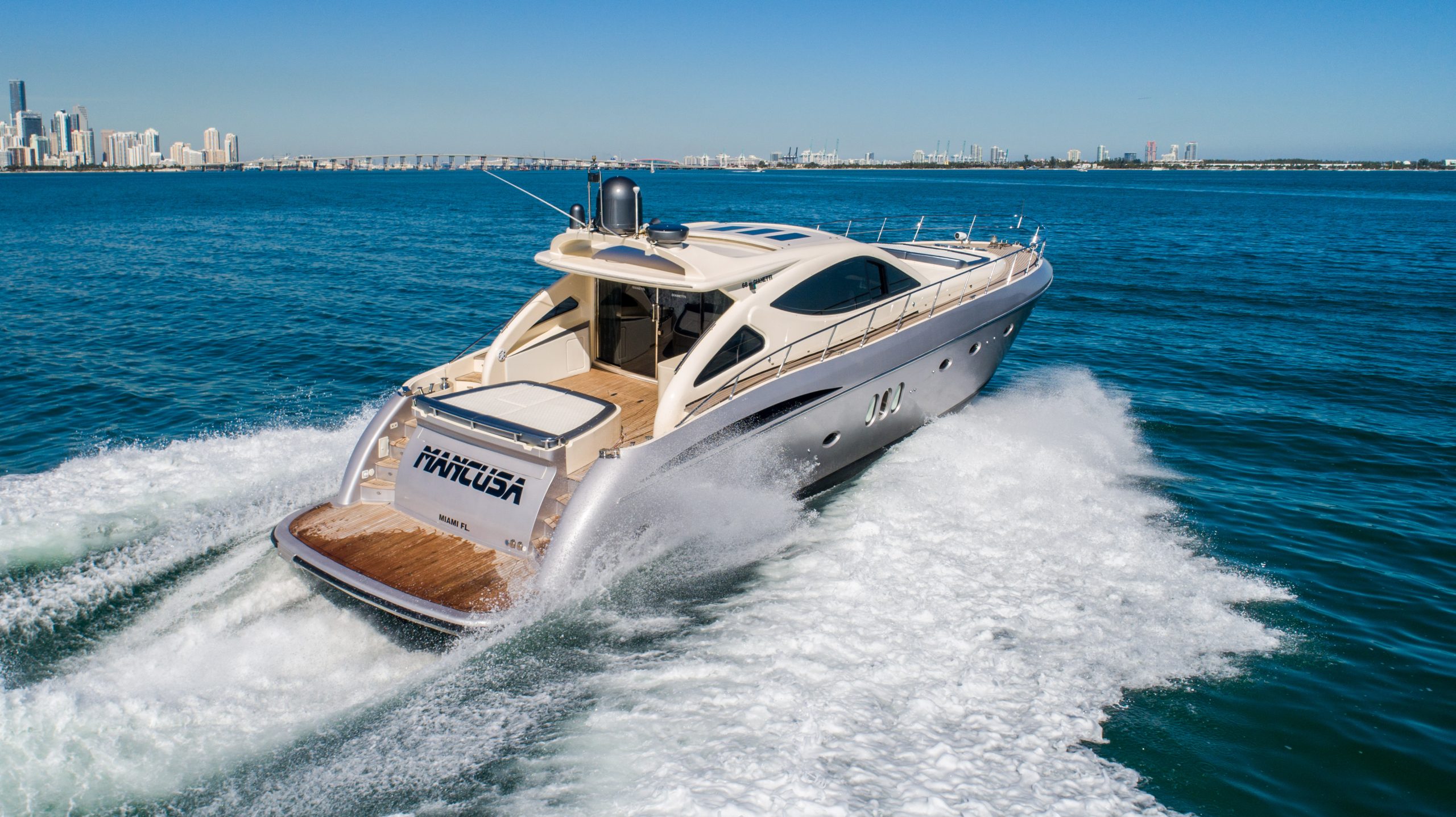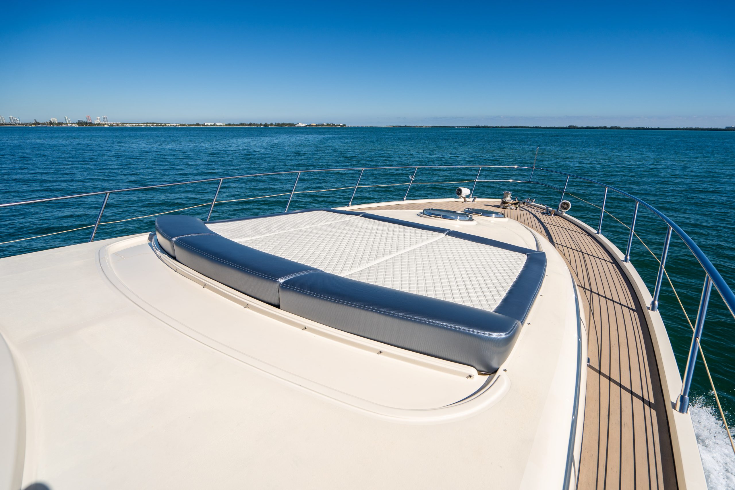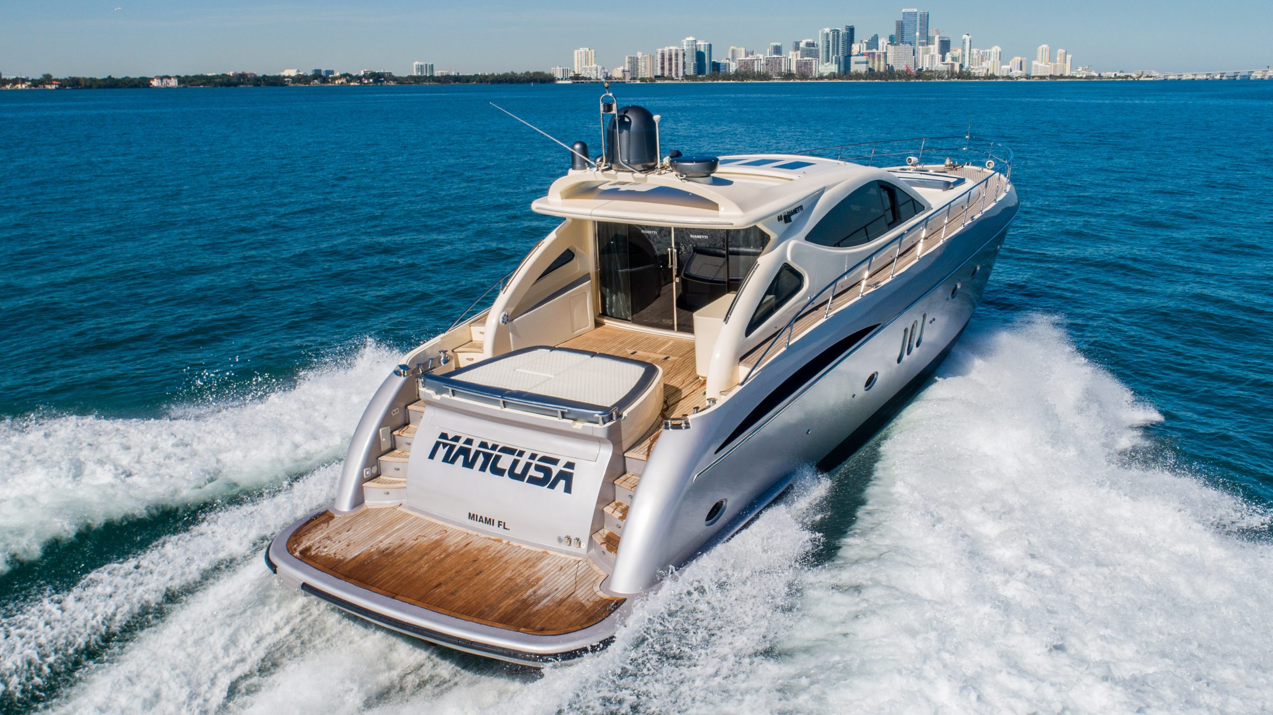 From the premium stereo system, flat-screen TV’s you will feel like you are in the lap of luxury. This yacht is particularly well arranged for hosting large parties with it’s wide open and thoughtfully arranged salon area. The 68 Gianetti is a sleek and fast vessel capable of cruising at around 30 knots.