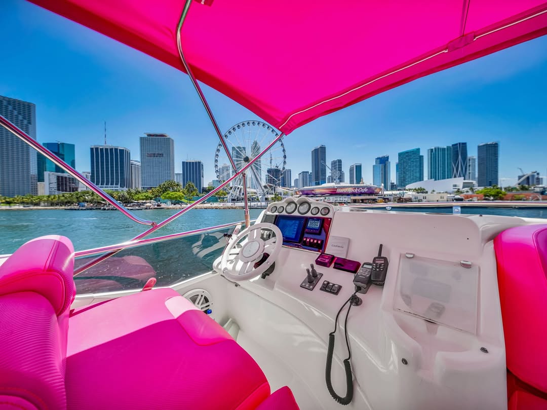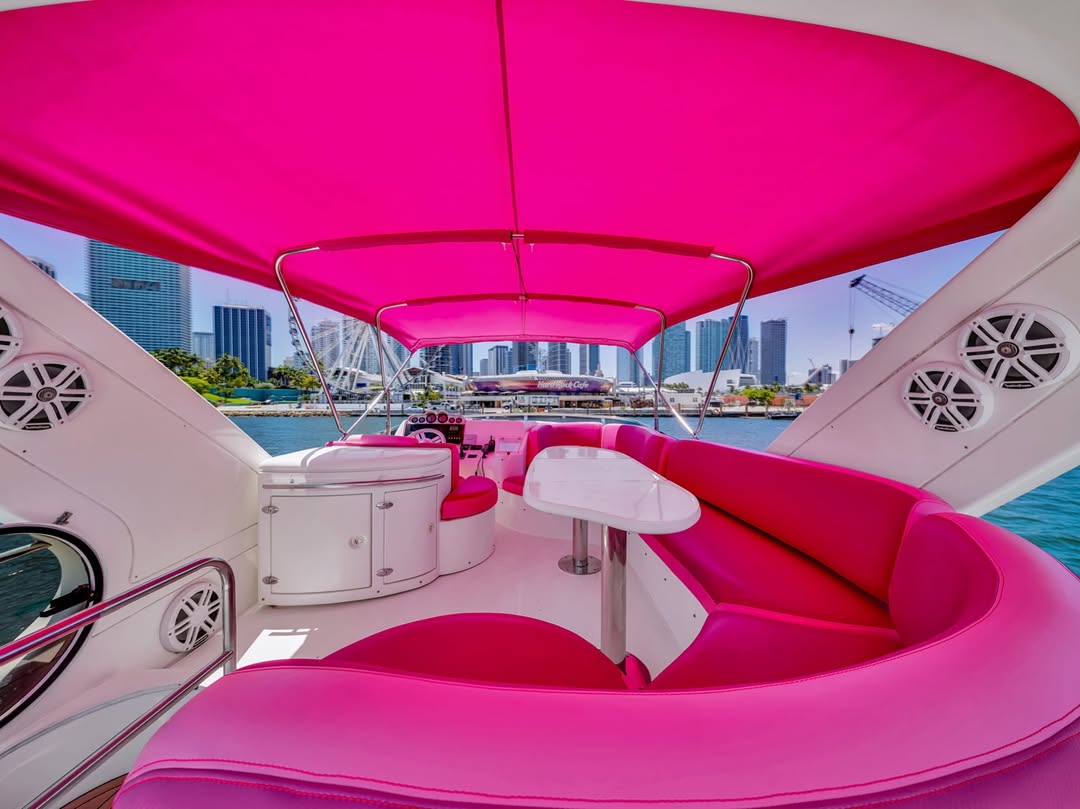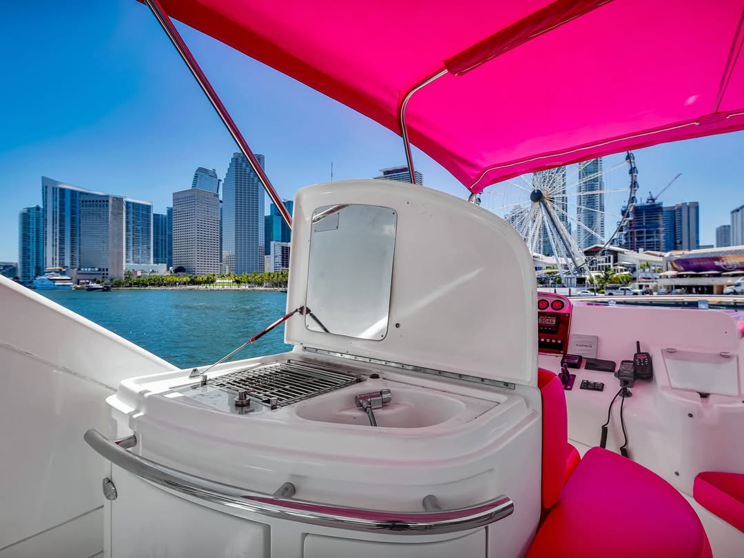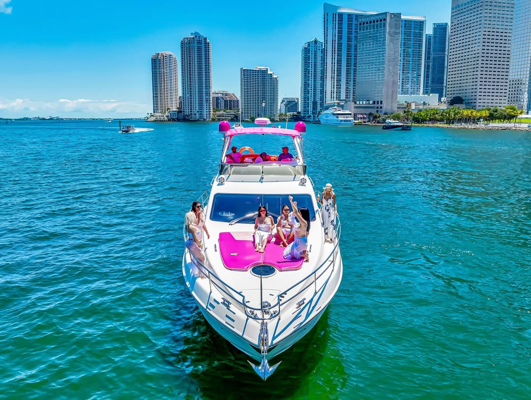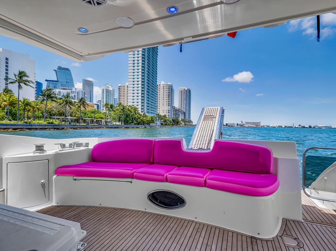 55 feet of sleek lines, pink accents, and pure Miami energy. Perfect for birthdays, bachelorettes, or a laid-back day with the girls. Stretch out on the bow, sip something cold up top, and let the city watch you glide by.