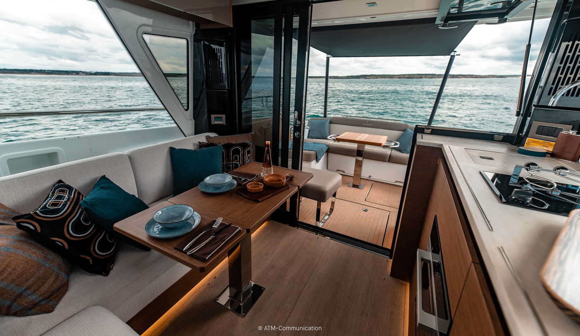 The interior features a galley to port with refrigerator, cook-top, and lots of storage inside and out. The fully loaded helm is well laid out and includes a joystick that makes tight quarters docking a breeze.